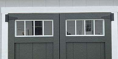 Add some character to your shed doors by with inset transom windows. Although very attractive, they also add needed light into the shed.