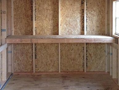 Our work bench runs the full width of the shed and is 24" deep. Perfect for a potting bench or tool bench. It also can be used as a nice storage shelf for boxes.